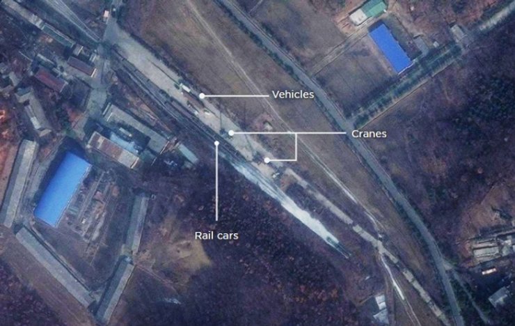 "На фотоснимках, сделанных 22 февраля компанией DigitalGlobe, видно легковые автомобили и грузовики, припаркованные у объекта. Рядом - железнодорожные вагоны, где также установлены два крана", - говорится в сообщении.