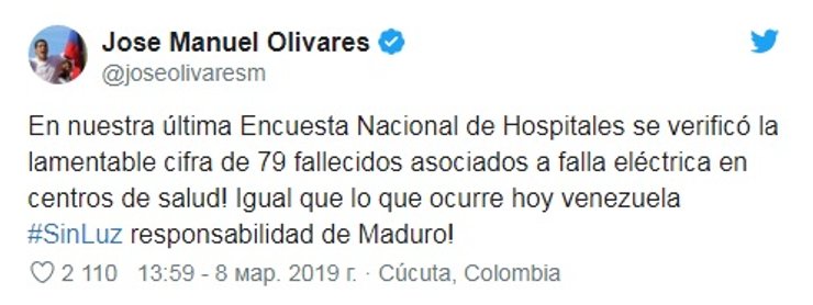 Депутат Национальной ассамблеи Хосе Мануэль Оливарес сообщил, что за последние четыре месяца из-за проблем с электроэнергией в больницах Венесуэлы умерли 79 пациентов.
