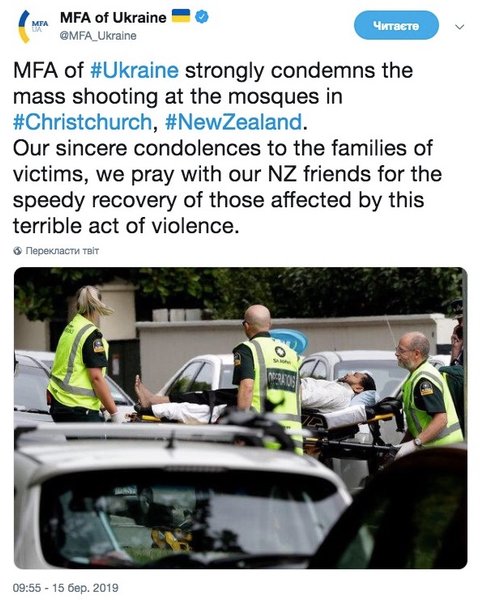"МИД Украины решительно осуждает массовые расстрелы в мечетях в Крайстчерче, Новая Зеландия. Наши искренние соболезнования семьям жертв, мы молимся вместе с нашими друзьями из Новой Зеландии о скорейшем выздоровлении тех, кто пострадал от этого ужасного акта насилия", - говорится в сообщении министерства.