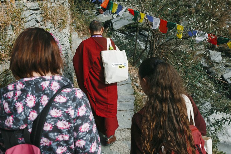 У тибетцев есть красивая церемония развешивания молитвенных флажков. У каждого из нас было семь флажков разного цвета, на которых мы рядом с молитвами писали имена наших близких. Затем мы их соединили в огромную гирлянду, совершили специальный обход за благополучие Украины и вывесили у подножия резиденции Далай-Ламы. Также мы увидели фотографии тибетской "небесной сотни", вывешенные в Дхарамсале. Это тибетцы, которые остались на оккупированной Китаем территории, и в качестве протеста сожгли себя перед представительствами власти или посольствами.