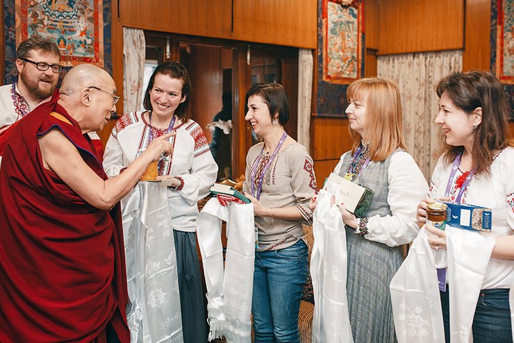 Обмен дарами. В начале аудиенции украинская группа вручила подарки Далай-ламе XIV, и он поговорил с каждым участником