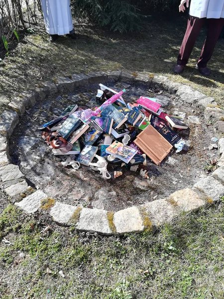 Кроме "Гарри Поттера", "Сумерек" Стефани Майер и некоторых других книг, в костер попали розовый зонтик Hello Kitty, статуэтки кота и слона, африканская маска и изображение индуистского божества.