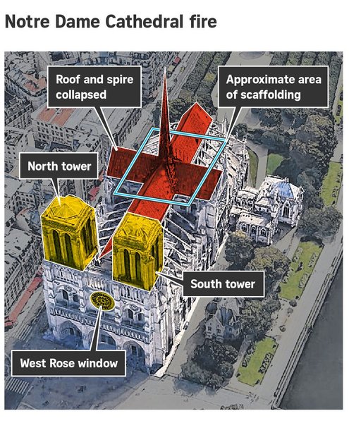 Младший министр внутренних дел Лоран Нуньес заявил, что масштабное исследование здания пока не развернуто из-за того, что неизвестно, насколько пожар ослабил конструкцию готического здания.