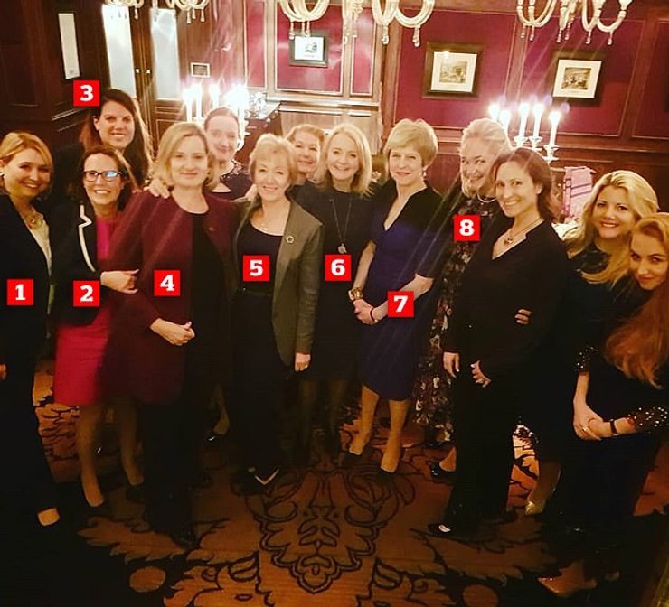 1) Карен Бредли, Секретарь по Северной Ирландии; 2) Баронесса Эванс, председатель палаты Лордов; 3) Каролин Нокис, Иммиграционный министр; 4) Эмбер Радд, Секретарь пенсионного фонда; 5) Андреа Лидсом, председатель палаты Общин; 6) Лиз Трасс, Секретарь Казначейства; 7) Тереза Мэй; 8) Любовь Чернухина