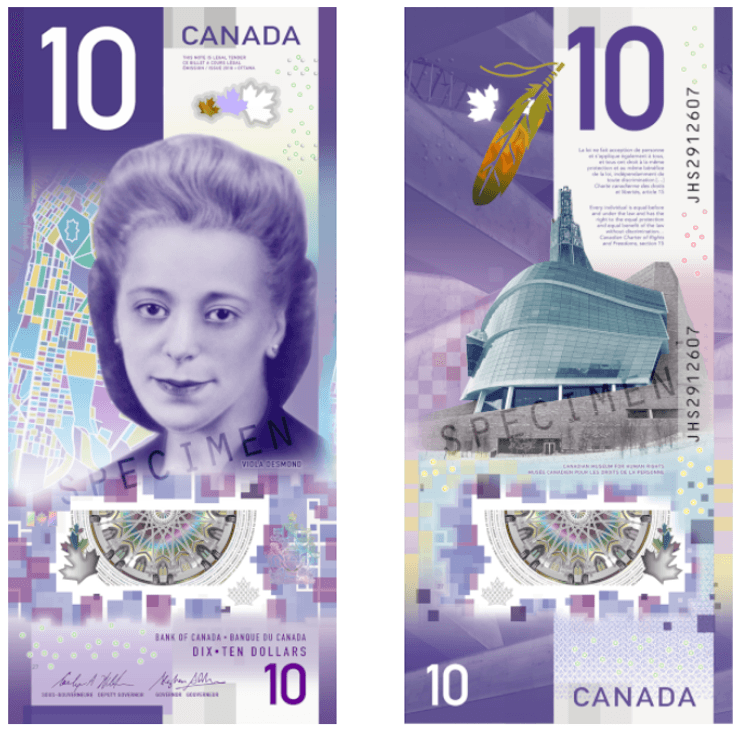 На одной из сторон вертикально ориентированной купюры изображена Виола Десмонд, известная своей борьбой с расовой сегрегацией. С другой – Музей прав человека в Виннипеге.