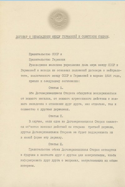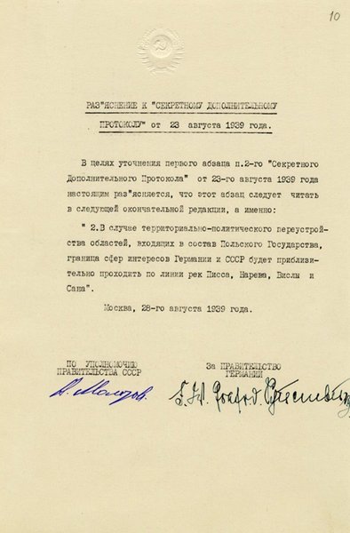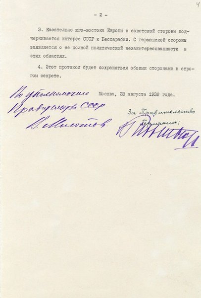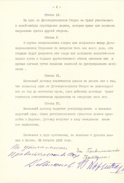 Документы напечатаны на пишущей машинке, под ними стоят подписи народного комиссара иностранных дел СССР Вячеслава Молотова – "полномочием Правительства СССР" – а также министра иностранных дел Германии Иоахима фон Риббентропа.