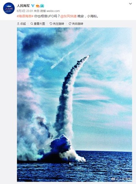 Военно-морские силы Китая также разместили в соцсети Weibo фото, на котором запечатлен запуск баллистической ракеты из-под воды, подписав его таким же текстом: "Вы верите в НЛО?"