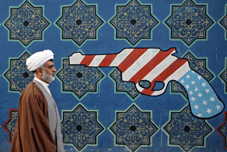Аргумент кольта. Иранский священнослужитель проходит мимо фрески на стене бывшего посольства США в период очередного ухудшения двусторонних отношений
