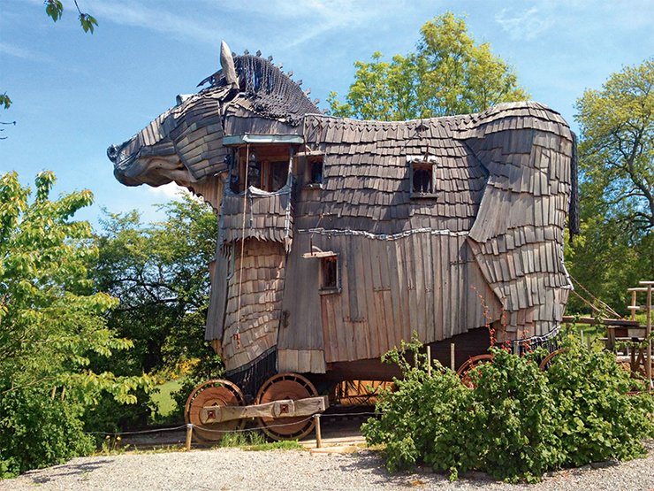 Девиз отеля в южной Бельгии: "Реально все, что вы воображаете". Этим принципом руководствовался архитектор Доминик Ноэль, спроектировавший десять номеров со сказочными интерьерами. В гостинице, название которой переводится как "Прогулка гномов", вы найдете номер-корабль, пещеру тролля, африканскую хижину, тропический остров с настоящим песочным пляжем и магический лес. Самые же поразительные объекты — троянский конь, домик в форме гигантской деревянной лошади, и старинная цыганская кибитка, где тоже можно остановиться. В такой же сказочной манере оформлен и ресторан "Горгулья", на создание которого вдохновили сказки братьев Гримм, произведения Льюиса Кэрролла и Льюиса Стивенсона. Поблизости находится Дюрбюи, считающийся самым маленьким городом в мире. Тем не менее там можно посмотреть исторический центр, сохранившийся с XVII века, красивый замок и парк с большим лабиринтом.