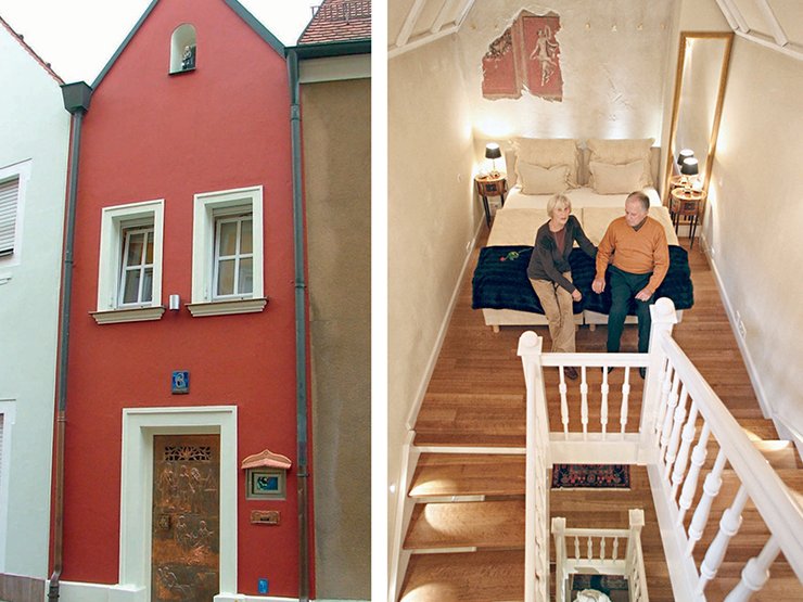 Миниатюрный отель в Баварии с шириной фасада 2,5 м имеет лишь один номер и вмещает два человека. Однако поразительны не так его размеры, как история, которая начинается в 1728 году. В то время по баварским законам люди, которые хотели пожениться, должны были владеть недвижимостью. Но далеко не все могли себе ее позволить. Поэтому один предприимчивый житель Амберга решил помочь брачующимся и построил некое подобие здания — просто поставил две стены и крышу в небольшом пространстве между уже существующими домами в центре города. Перед свадьбой пары покупали это пространство по сходной цене, а после церемонии сразу же его продавали другим нуждающимся в подтверждении своего материального статуса. С тех пор здание называется Eh"hausl, "свадебный дом", а с 1976 года, после двух реконструкций, здесь гостиница.