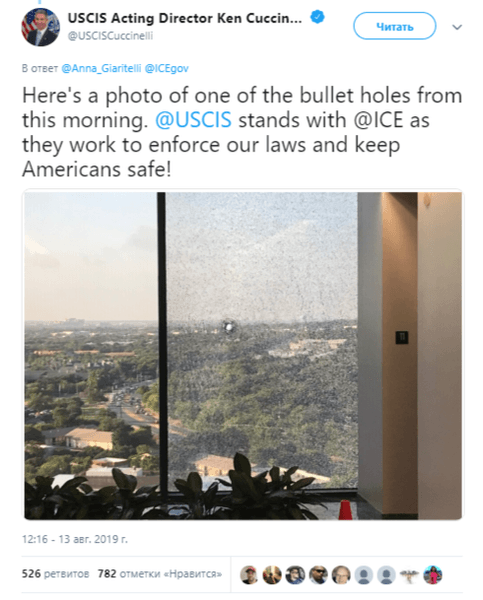 Обстрелу подверглись офисы ICE в Сан-Антонио, которые были совершены около 03:00 по местному времени (08:00 по Гринвичу). По словам полиции, было совершено несколько выстрелов, но к счастью, никто не пострадал. Один из выстрелов попал в окно здания.