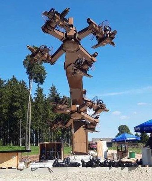 23-метровый аттракцион, окрашенный в коричневый цвет, ввели в эксплуатацию в начале августа. На нем установили две конструкции с сидениями, каждое из которых украшено головой орла. При запуске аттракциона эти конструкции вращались, внешне напоминая свастику.