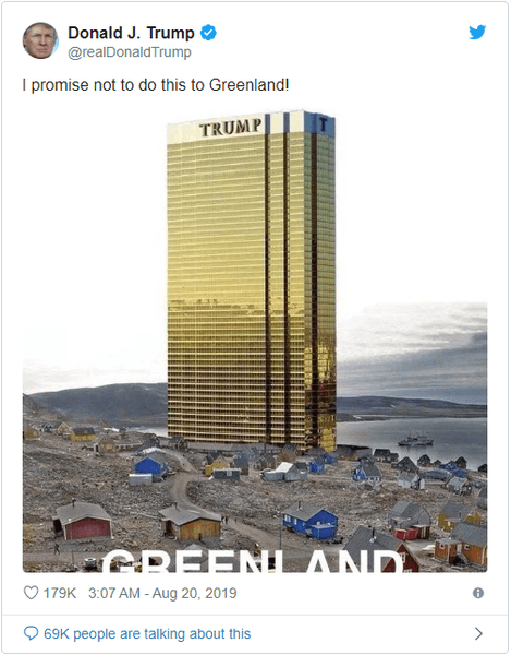 Изображение "золотого" небоскреба на фоне небольшого прибрежного города, появилось после заявлений Трампа о возможной покупке Гренландии. Датская сторона дала однозначный отказ президенту США.