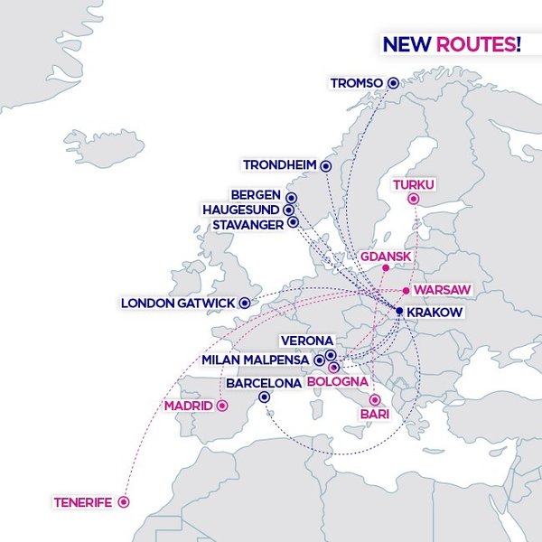 В частности, мадьярский лоукостер будет выполнять перелеты из Варшавы на Тенерифе (Испания), в Болонью (Италия), Мадрид (Испания) и Турку (Финляндия). Из Кракова – в Тронхейм, Берген, Ставангер, Гаугесун, Тромсе (Норвегия), Верону, Милан-Мальпенса, Болонью (Италия), Барселону (Испания), Лондон-Гатвик (Великобритания). Из Гданьска – в Бари.