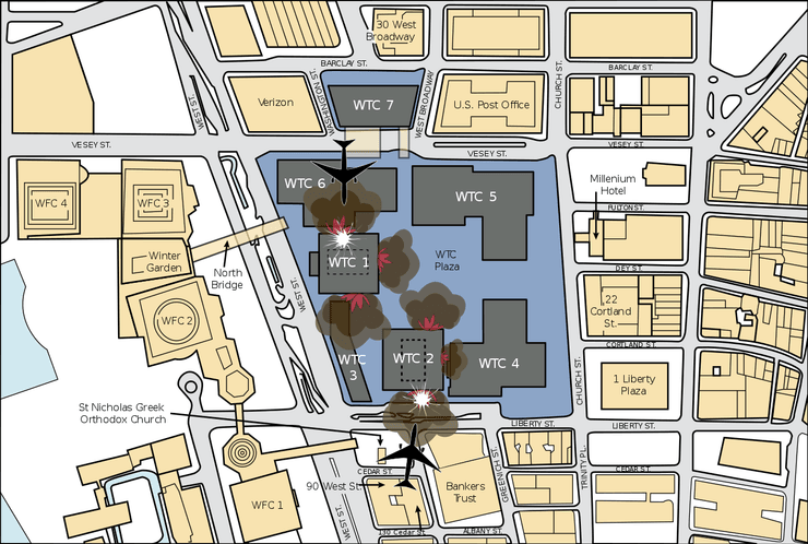 В результате теракта Башни-близнецы ВТЦ были полностью уничтожены.