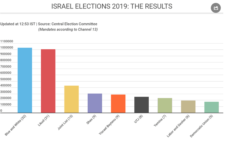По состоянию на утро 18 сентября, Центральная избирательная комиссия Израиля подсчитала 56% голосов, общая явка составила 69,4%. Так, по предварительным данным, партия "Синий и белый" получает 32 места в парламенте, а "Ликуд" - 31, партия "Общий список" – 13. Также ультра-религиозная партия ШАС получила 9 мест, национально патриотическая партия "Наш дом Израиль" Авигдора Либермана – 9 мест.