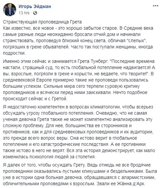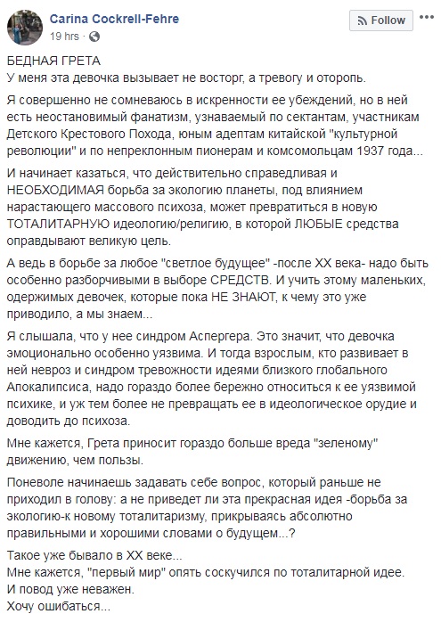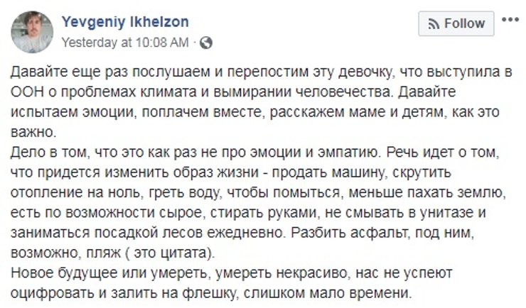 Но, признавая, что Грета Тунберг говорит по делу, а тысячи людей, вдохновленные ее примером, выходят на улицы и ученые подписывают заявление, в которых отмечают, что она совершенно права – экология страдает, а будущее безрадостно, стоит задуматься, оказывают ли ее выступления реальный эффект.