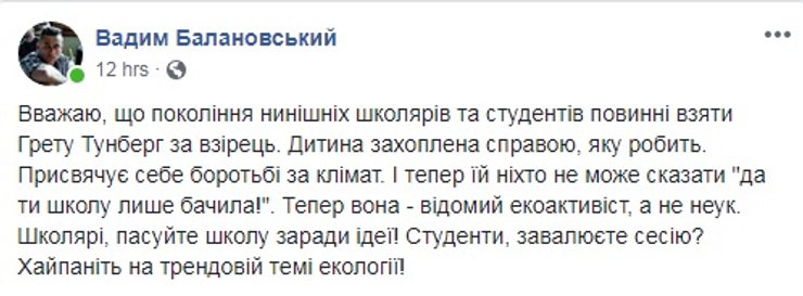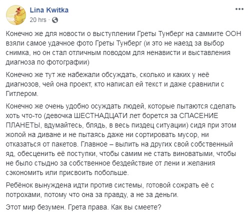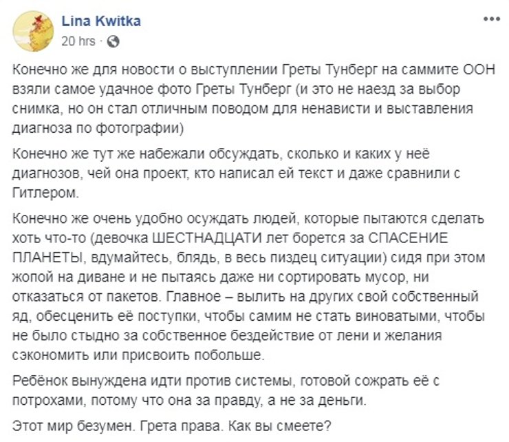 16-летняя школьница из Швеции стала одним из лидеров экологического движения мирового масштаба. По ее призывам тысячи людей выходят на митинги на всех континентах, ее выступление слушают президенты и премьеры на Генассамблее ООН, а инициативы активно обсуждают в соцсетях, в том числе и в их украинском сегменте