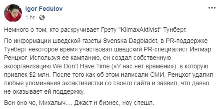 Еще одним "чудесным" совпадением она называет тот факт, что ее одиночный протест под зданием шведского парламента был замечен известным PR-специалистом Ингмаром Рентцхогом. Именно он запустил вирусное видео с протестующей Гретой, которое привлекло внимание общественности. Критики заявляют, что Ингмар неплохо заработал на шумихе с Гретой, основав экологический стартап We Don't Have Time, он же тот факт, что использовал образ Греты для заработка отрицает, а ее родители говорят, что больше с ним не сотрудничают. Но факт остается фактом - их встреча была взаимовыгодной для обоих сторон.