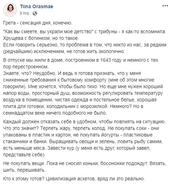 Многие пользователи поддержили Грету, напомнив насколько важно, но и сложно жить эклогически чисто. Отказаться от автомобиля на бензине, не пользоваться пластиком, а возможно еще и отключить отопление и есть только сырую пищу.