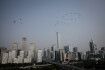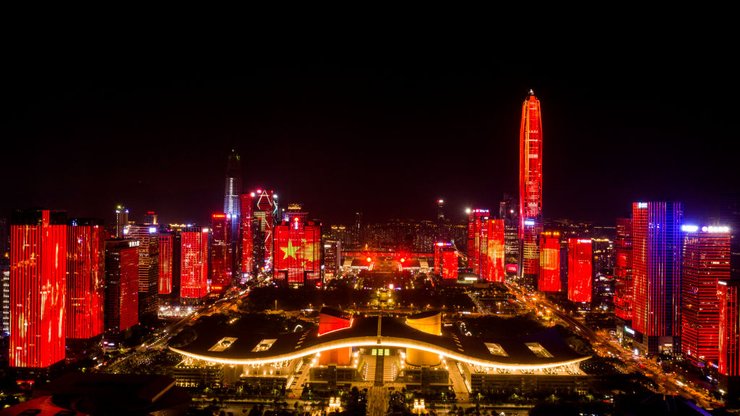 Высотные здания освещаются во время светового шоу, посвященного 70-летию основания Китайской Народной Республики в Шэньчжэне, провинция Гуандун, Китай. Фото: Getty Images