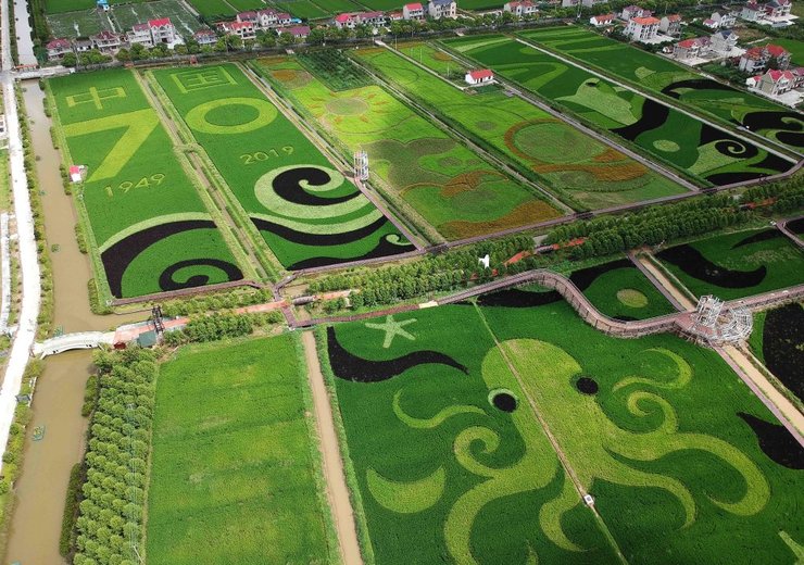 В деревне Хэнша в окрестностях Шанхая по случаю юбилея на рисовых полях площадью в 2 гектара создали орнаменты на морскую тематику. Узоры созданы с помощью подсолнухов, вербены, различных цветов и растений, высаженных на рисовых полях.