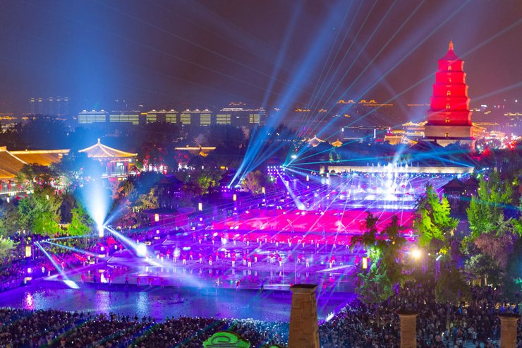 Танцоры открывают световое шоу рядом с башней Dayan Tower, накануне празднования 70-летия образования КНР в провинции Шэньси. Фото: Getty Images