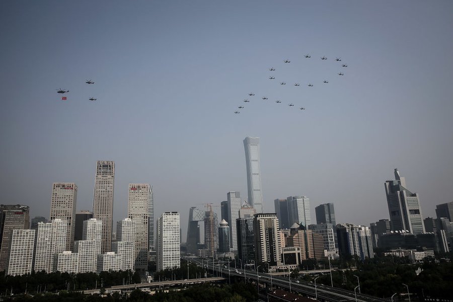 Сегодня по случаю 70-летнего юбилея в Пекине прошел масштабный военный парад. По центральным улицам китайской столицы промаршировали 15 тысяч военнослужащих, проехались 580 единиц военной техники, а в небе пролетели 160 самолетов. Во время 80-минутного парада публике продемонстрировали новинки китайского оборонпрома, включая новейшие беспилотники и баллистические ракеты. Среди них – и гиперзвуковую баллистическую ракету DF-17, которая, как предполагается, способна пробить все существующие противоракетные щиты США и их союзников. Кроме военных праздничным шествием также прошли колонны рабочих, служащих и крестьян, которые должны были продемонстрировать привеженность народа коммунистическим идеалам в их современной трактовке. Принимал парад председатель КНР Си Цзиньпин, а также его предшественники на посту Ху Цзиньтао и Цзян Цзэминь.