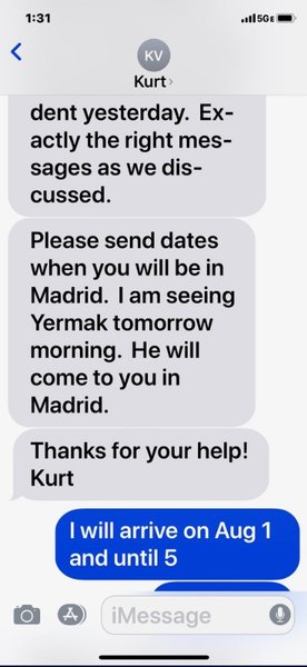"Встречаюсь с Ермаком завтра утром. Он приедет к вам в Мадрид", – писал Волкер Джулиани.