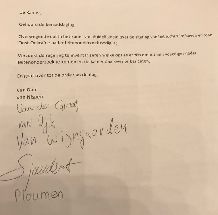 Предложение CDA (Христианско-демократической партии) по дополнительному расследованию причин, по которым Украина не закрыла воздушное пространство над Донбассом во время боевых действий в 2014 году единогласно поддержал парламент Нидерландов.