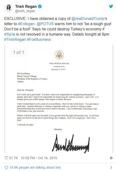 "Давайте поработаем над хорошей сделкой! Вы не хотите нести ответственность за убийство тысяч людей, а я не хочу нести ответственность за уничтожение турецкой экономики, но я это сделаю. История будет к тебе благосклонной, если ты сделаешь это правильно и гуманно. Но в противном случае, ты навечно останешься дьяволом", – написал Трамп в письме.