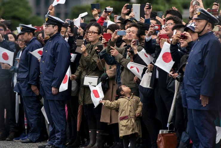 Японцы с национальными флагами встречают Нарухито, выходящего из Императорского дворца