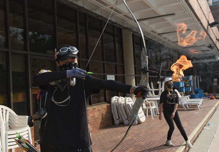 В кампусе забаррикадировались сотни вооруженных кирпичами и коктейлями Молотова студентов. Полиция применяет слезоточивый газ и водометы. Протестующие, в ответ на это, начали использовать луки и стрелы.