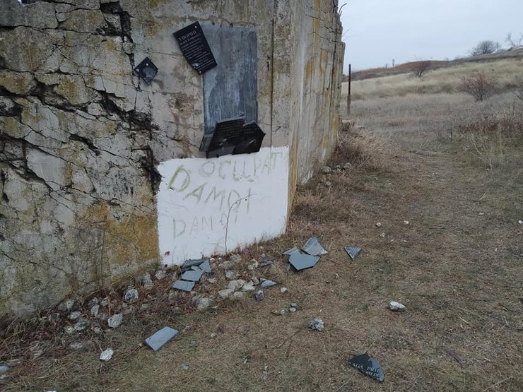 Он рассказал, что "нелюди" разбили плиты отвалившимися кусками бетона и оставили надпись на памятнике – "Оккупанты, домой!"