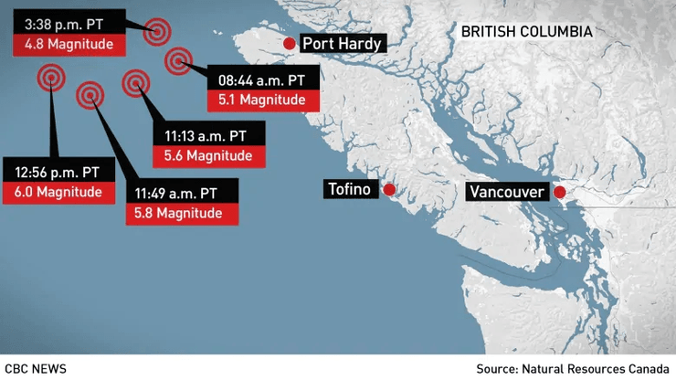 Эпицентр землетрясений находился в Тихом океане в 100 километрах от острова Ванкувер. Глубина эпицентра – пять километров.