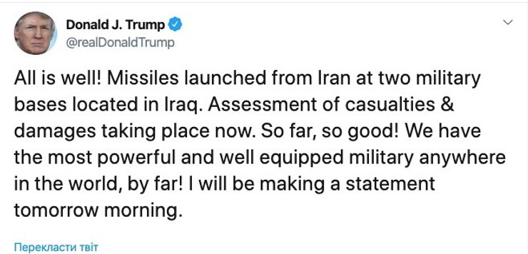Но Трамп написал в Twitter: "Все хорошо! Ракеты выпущены из Ирана по двум военным базам, расположенным в Ираке. В данный момент осуществляется оценка жертв и повреждений. Все идет нормально! … Я сделаю заявление завтра утром".