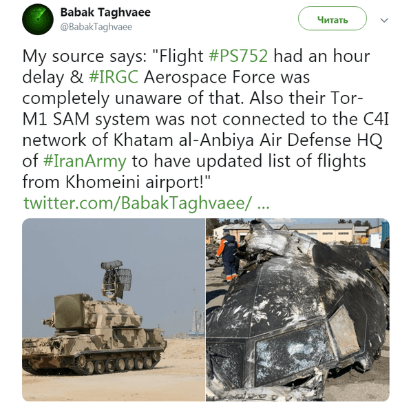 Вторая причина ракетной атаки, по словам эксперта, состоит в том, что зенитный ракетный комплекс (ЗРК) "Тор-М1" не был подключен к C4I – автоматизированной системе управления и разведки. Из-за этого у оператора системы не было фактических данных о вылетах из тегеранского аэропорта.
