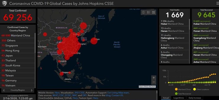 В воскресенье, 16 февраля, в мире количество инфицированных коронавирусом выросло до 69 256 человек, большинство из которых находятся на материковом Китае. Об этом свидетельствуют данные из сервиса для отслеживания распространения коронавируса от Центра системных исследований при Университете Джона Хопкинса.