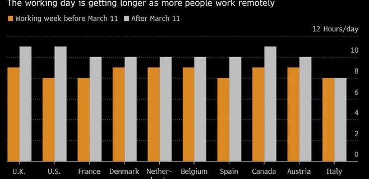 Переход на удаленную работу, в связи с распространением коронавируса, для многих продлевает рабочий день. К такому выводу пришли аналитики Bloomberg, проанализировав, как люди работают в условиях карантина в разных странах.