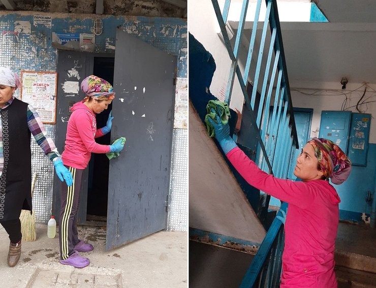 Также в одном из подъездов сняли, как дезинфекцией занимается беременная, причем из средств защиты у нее обычная медицинская маска и латексные перчатки.