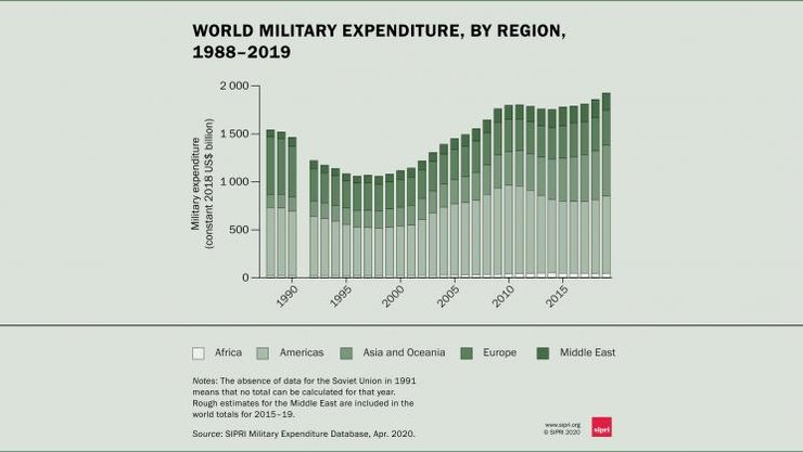 Расходы всех стран мира на оборону в 2019 году составили 1,917 триллиона долларов. Согласно отчету Стокгольмского института проблем мира (SIPRI), это самая большая сумма, потраченная на оборону с момента начала исследований в 1988 году.