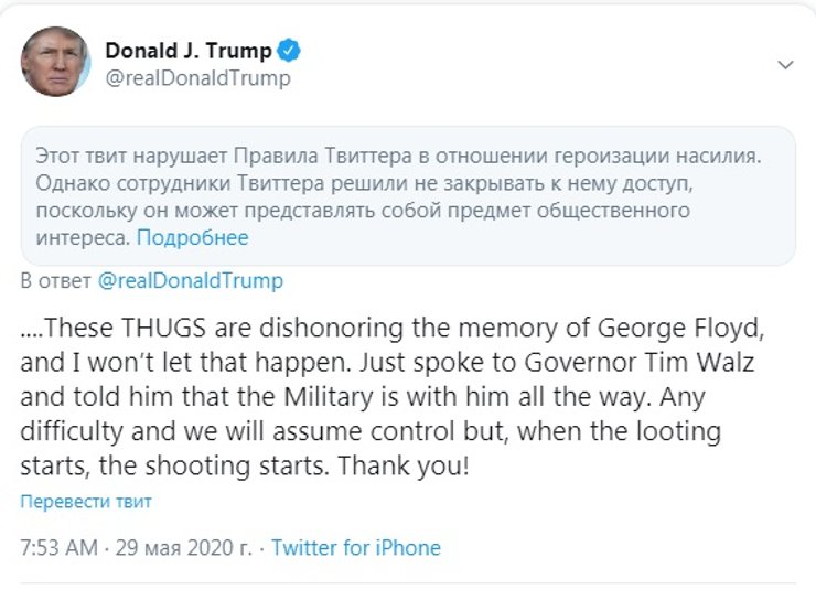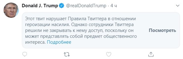 Вместо него в Twitter Трампа теперь стоит сообщение: "Этот пост нарушает правила Twitter в отношении героизации насилия. Однако сотрудники Twitter решили не закрывать к нему доступ, поскольку он может представлять предмет общественного интереса".