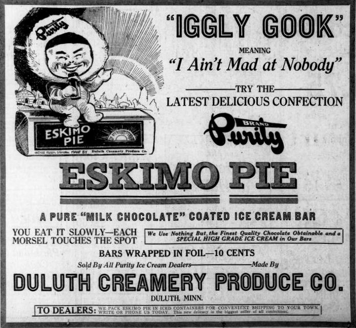 На упаковке "пирожка с мороженым" изображен мальчик в традиционной меховой одежде эскимосов. Десерт, который компания производит уже столетие, представляет собой сливочное мороженое, помещенное между двумя бисквитами, в шоколадной глазури.