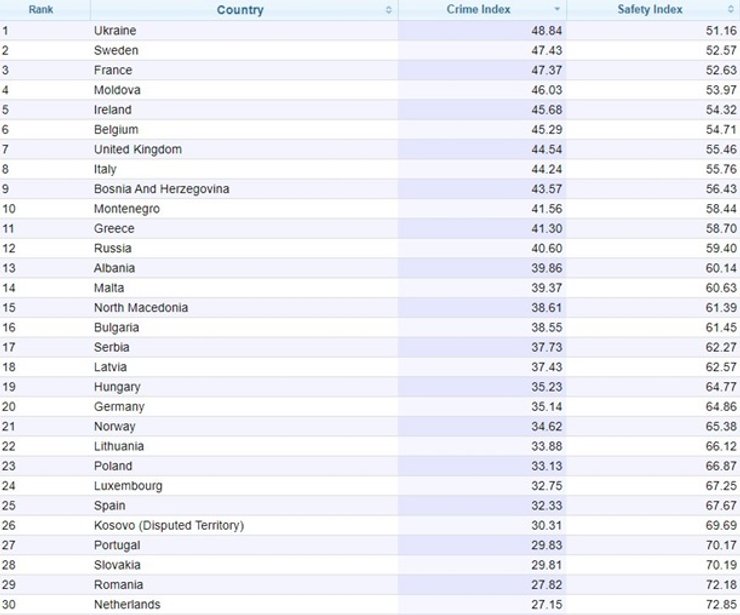 Аналитики Numbeo опубликовали очередной индекс преступности в разных государствах. Среди стран Европы, Украина - первая с показателем 48,84. Также в тройке лидеров Швеция (47,43) и Франция (47,37).