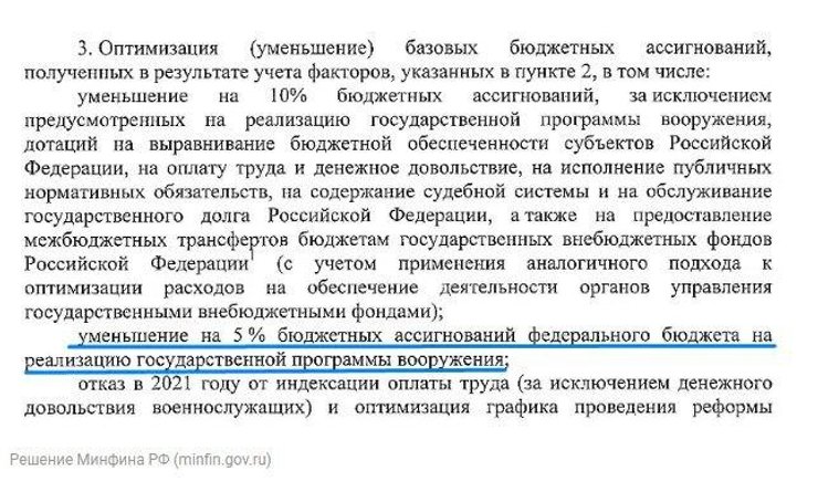 "Уменьшение на 5% бюджетных ассигнований федерального бюджета на реализацию государственной программы вооружений", – говорится в документе.