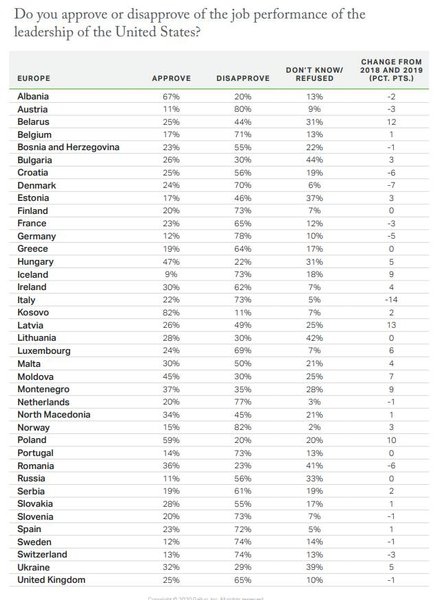 Среди 39 стран, принимавших участие в исследовании, жители лишь семи "с большей вероятностью одобряют, чем не одобряют руководство США". В их числе: Венгрия, Польша, Румыния, Молдова, Косово, Украина и Албания.