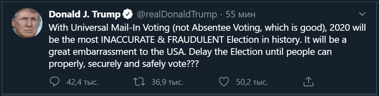"С универсальным голосованием по почте (не заочным голосованием, с которым все в порядке), выборы 2020 года станут самыми неточными и мошенническими в истории. Это станет огромной проблемой для США. Отложить выборы, пока люди не смогут должным образом, защищенно и безопасно проголосовать???" – написал Трамп.