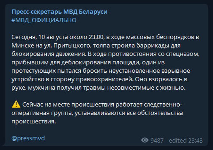 Сегодня, 10 августа около 23.00, в ходе массовых беспорядков в Минске, в результате взрыва неустановленного предмета погиб один из протестующих.