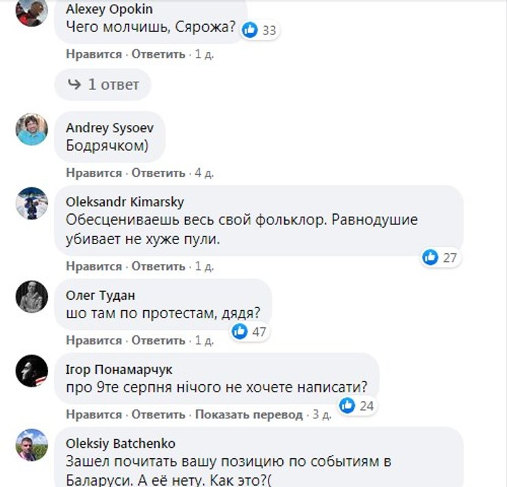 "Сергей, Вам там просили передать, что в Беларуси происходят тексты ваших песен", "Равнодушие убивает не хуже пули. Ты нам нужен, Сережа. Слово сильнее и важнее, чем кажется. Они боятся слов. А ты всегда хорошо острил", "Сергей, вас там силовики за яй*а наверное держат крепко сейчас, как Тихановскую?", "Видимо, вы про себя в будущем в этих песнях пели. Где ваша реакция на происходящее в Беларуси. Безразличие убивает не хуже пули! Может я ошибаюсь!? Но тишина пока что..." – пишут пользователи в комментариях под постом с анонсом концерта в Киеве.