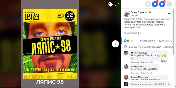 "Воин Света (Света - это не имя, хотя кто знает) завтра выступает в нк "Ибица" (Одесса). Потому что революции революциями, а работа работой", - написал в соцсети блогер Денис Гороховский.